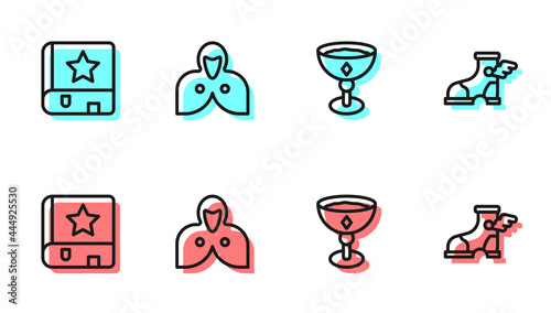 Set line Fireball, Witches broom, Magician and Hermes sandal. Glowing neon icon. Vector