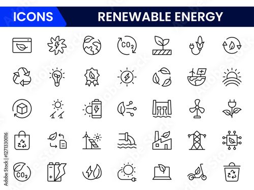 Collection of various line art vector icons representing renewable energy sources and sustainability concepts