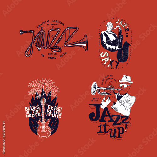 Set of jazz festival posters with saxophone, trombone, clarinet, violin, double bass, piano, trumpet, bass drum and banjo, guitar. Suitable for acoustic music events and jazz concert.