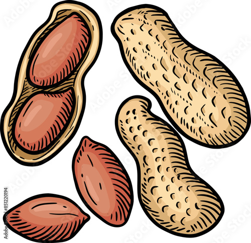 Peanuts set. Hand drawn sketch style ground nuts collection. Organic healthy food. Best for packaging design. Engraved style. Isolated on white background.