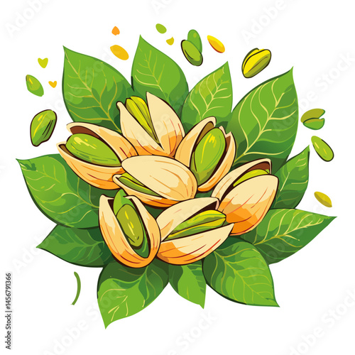 Pistachios kernel in nutshell with green leaves set isolated on white background vector illustration. Organic food ingredient, traditional snack. Pistachios nut seed whole and shelled collection.