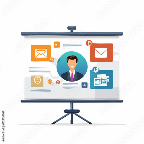 Business development, digital communication, professional work, online tools, office culture, graphic design. A computer with tasks, a professional holding a tablet and a bag. Business development