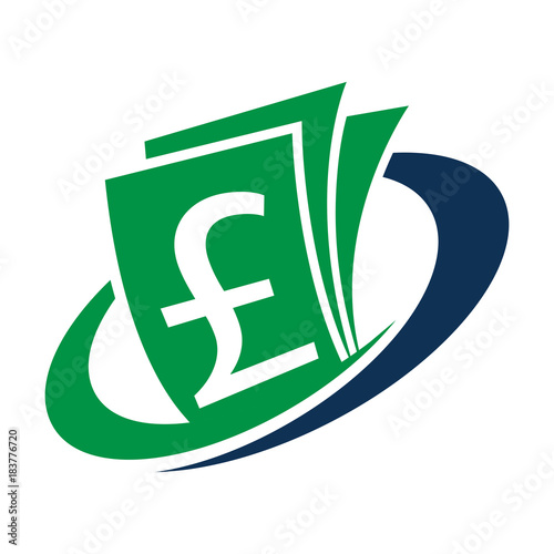 Two green round arrows with green pound sterling sign. Flat icon. Isolated on white.