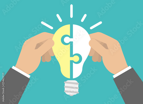 Hands of people of different nationalities putting together colorful pieces of puzzle in the shape of a lightbulb. Vector flat illustration