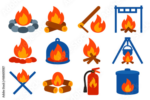 Campfire flames and logs set with transparent background