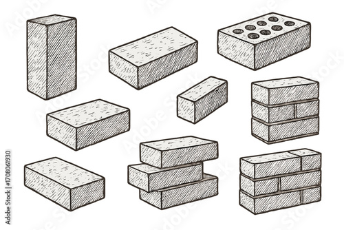 Building Materials Icons. Outline icon set of building materials: brick, cement bag, wooden plank, steel beam,