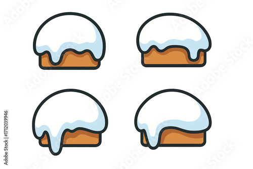 Vector snow caps set. Winter design of snow caps and icicles. Christmas, new year themed snow corners, dividers and frames. White blue ice decor. Snowy cartoon ice texture