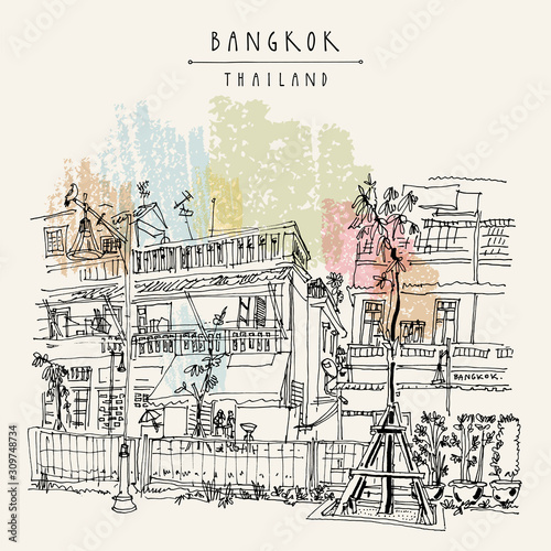 Cute vector houses in flat style with bushes and birds and text - our friendly neighborhood, illustration template