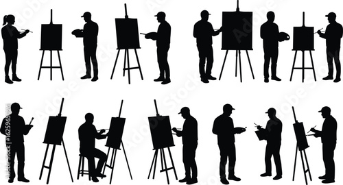 Silhouette of artists painting on easels, creative process in studio, artistic expression, workshop environment, drawing, sketching, painting session