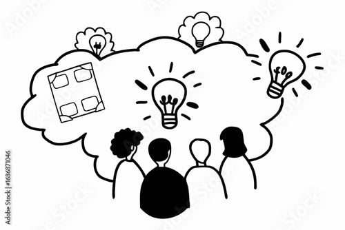Creative Collaboration Icons. Hand-drawn doodle illustration team creativity session group of people, light bulb, speech bubble, notebook, pencil, arrows,