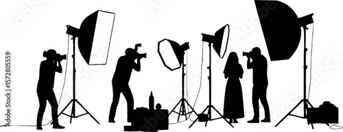 Silhouette of two photographers with studio lighting equipment in a photography session setting on white