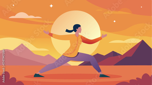 A person engaging in a tai chi session at sunrise with flowing movements illustrated against a tranquil landscape.