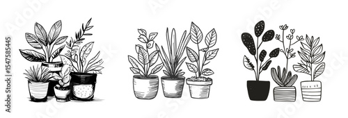 Houseplants in flowerpots. Vector hand drawn outlines, black and white sketch illustration isolated on white background. Design elements. Ecology concept.