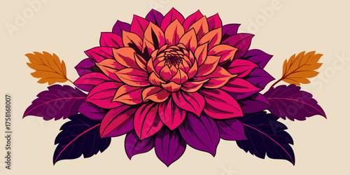 Bold, graphic illustration of a dahlia flower with vibrant pink, orange, and purple petals surrounded by dark leaves Modern car vector illustration Flat car icon Urban vehicle vector