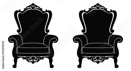 Two ornate vintage chairs are depicted in a striking black silhouette