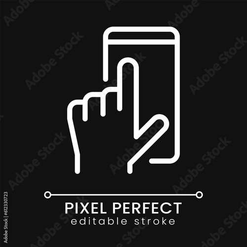 A hand touches smartphone screen, vector illustration. Mobile phone use: tap, hover, slide and swipe the symbol. Using a touch gesture of a digital device.