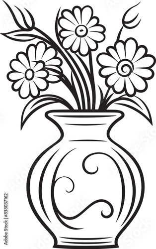Rose in vase drawing. It is a black and white outline image of a single rose in a vase, symbolizing beauty and grace. Vector sketch line art draw.