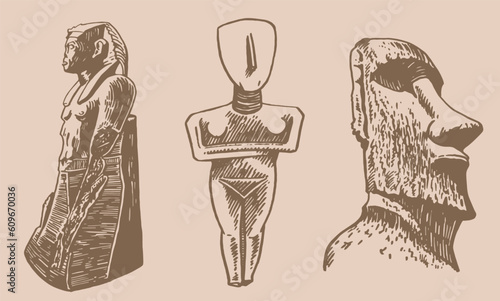 Graphical vintage set of landmarks, vector  God ptah,  holy mother statue and moai