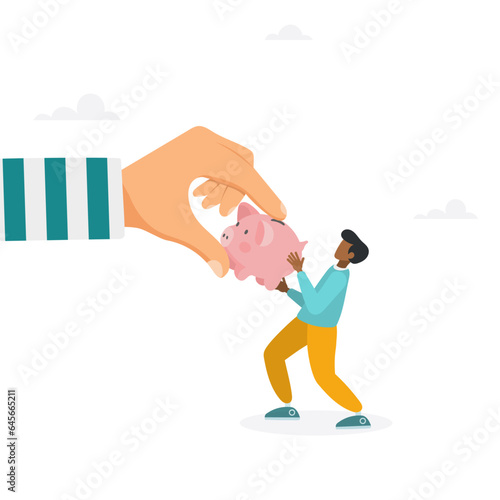Fraud and theft of savings. The guy snatches the piggy bank from the hands of the thief. Modern vector illustration in flat style