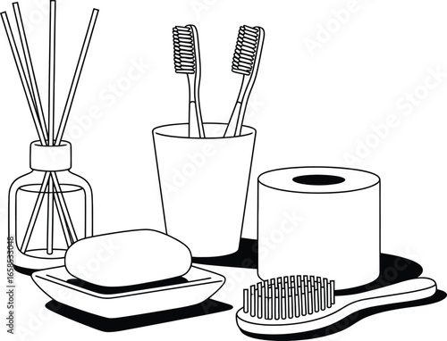 Zen, balance and harmony concept, wellness and spa treatments, stones, towel, plant branch, candle, oil, aroma diffuser with sticks, drawn with continuous line in minimalism, editable vector contour.