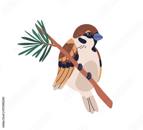 Sparrow perched on fir tree branch. Little small winter bird sitting on pine twig, sprig in wild nature. Avian animal, passer montanus, fauna. Flat vector illustration isolated on white background