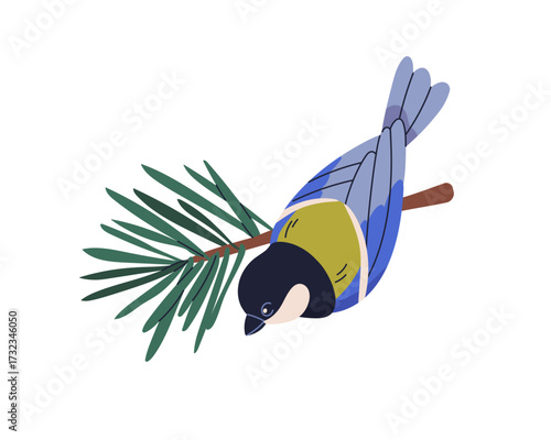 Little bird sitting on pine tree branch. Cute small tit perched on fir twig in forest. Wild winged animal, songbird in nature. Winter fauna. Flat vector illustration isolated on white background.
