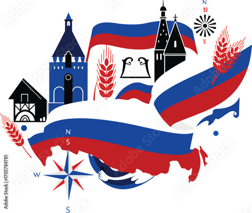 Blue map of Russian Federation administrative divisions with travel infographic icons.