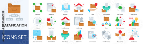 Datafication icon set vector Flat Style repositor, data mining, metadata, data warehouse, data, data extraction, data sharing, data cleaning, lifecycle, data privacy, data discovery