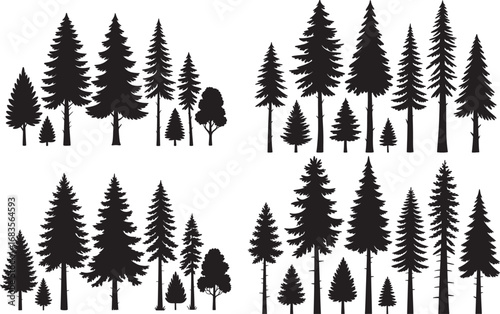 Silhouettes of coniferous trees, evergreen forest shapes, pine and fir outlines, botanical diversity, nature illustration, forestry design, isolated elements