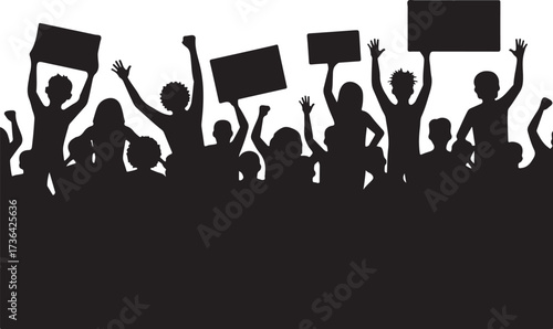 Protesters with banners and megaphones silhouettes, People holding fists up at a protest