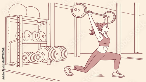 Fitness training illustration showing a woman doing lunges with dumbbells on a gym mat, stopwatch and water bottle nearby, progress, and motivational headline area