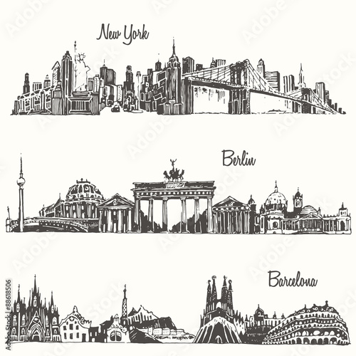 A black and white illustration of a cityscape with various buildings on a horizontal line