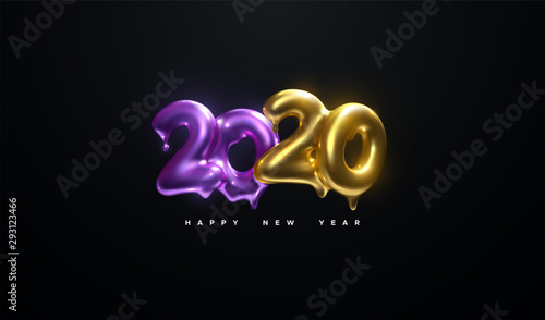 Happy New 2020 Year. Holiday vector illustration of golden and purple metallic numbers 2020 on black background. Melted metallic paint characters. Realistic 3d sign. Festive poster or banner design