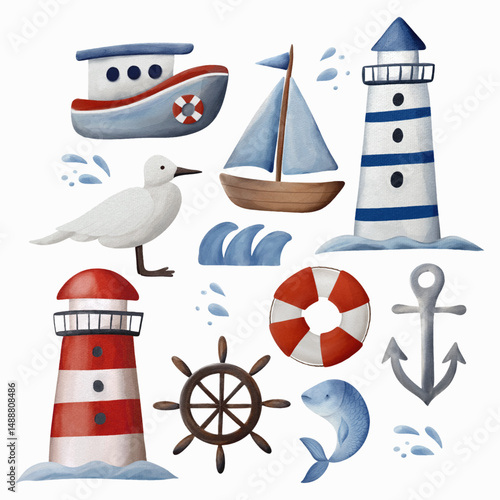 Watercolor nautical set with cute hand-painted sea-themed elements: lighthouse, sailing boat, fishing boat, seagull, waves, lifebuoy, ship wheel, anchor, and fish.