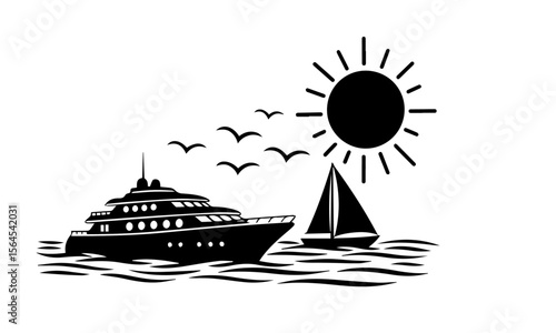 Silhouette of a sailboat on waves in a minimalist black and white vector design.