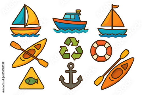 Marine icons set. Vector cartoon collection of boats, sailboat, kayak, anchor, lifebuoy. Sea travel, water sport and ecology concept with recycling symbol. Flat design.