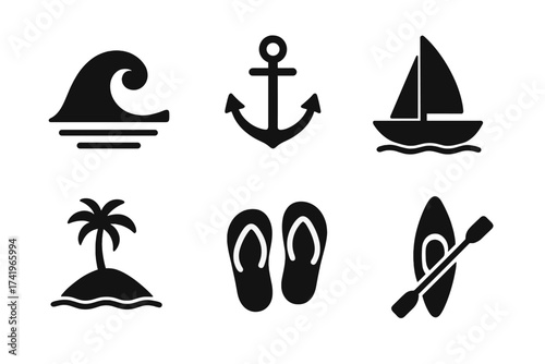 Sea and ocean icon set for summer vacation and travel concepts. Vector collection with wave, anchor, sailboat, tropical island, flip flops and kayak symbols. Marine and nautical.