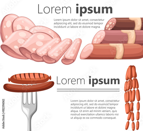 Cartoon style meat products. Illustration different kinds of slices and sausage. Presentation of meat products for cafes and restaurants. Isolated on white background.