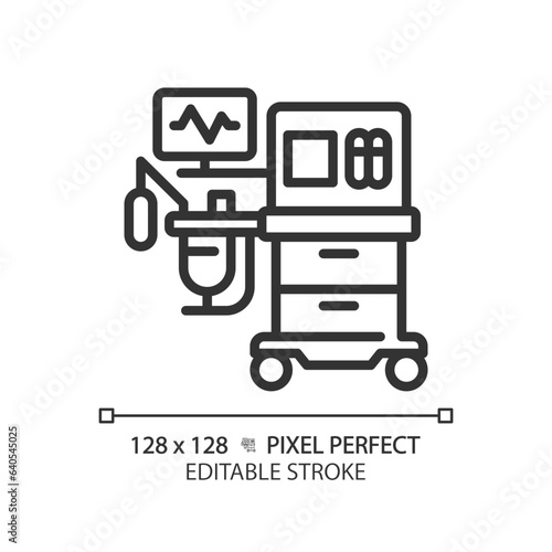 Anesthesia machine pixel perfect linear icon. Surgical equipment. Medical ventilator. Operating room. Critical care. Thin line illustration. Contour symbol. Vector outline drawing. Editable stroke