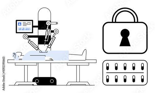 Robotic surgical system operating on a patient, with a lock symbol and keyboard representing security and data protection. Ideal for healthcare, technology, cybersecurity, medical innovation, digital