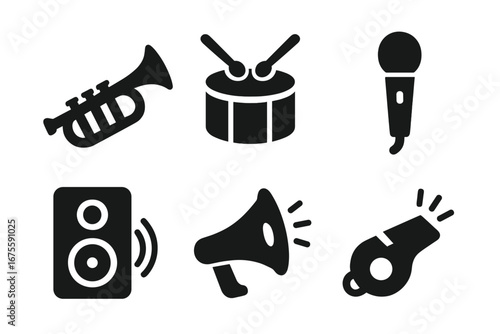 Music and sound icons set. Solid glyph vector collection for parade, festival, or concert. Includes trumpet, drum, cymbals, microphone, speaker, and horn symbols.