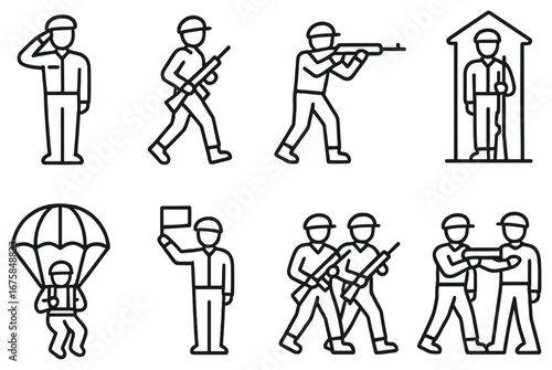 Flat style military soldiers in various uniforms and poses with weapons
