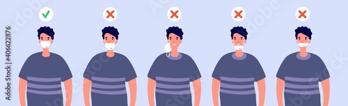 Vector cartoon portrait young male wearing medical face protective mask correctly and wrong. Health care concept to avoiding air pollution or illness and virus illustration isolated on background.