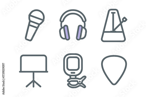 Simple Line Icons of Music Stands, Reels, and a Microphone on Stands for Music Production...