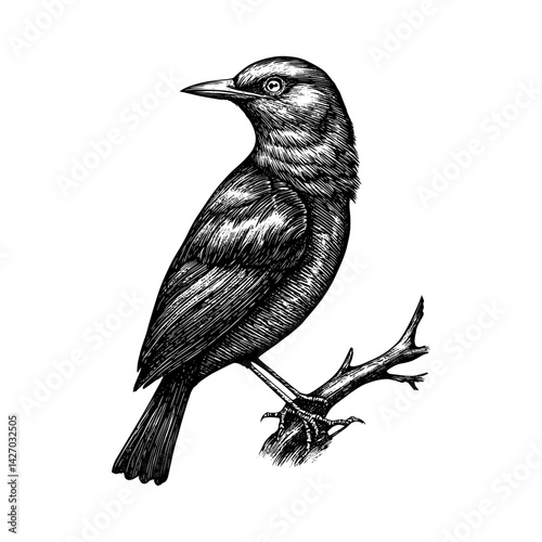 A vigilant dog stands alert in a field of grass and bare branches, its silhouette sharply defined against the white background isolated on white background the dog is watchful