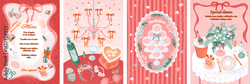 Bachelorette party. Cute vector illustration of bride decor, menu, champagne tower, festive table setting and chandelier for invitation, greeting card, poster or background