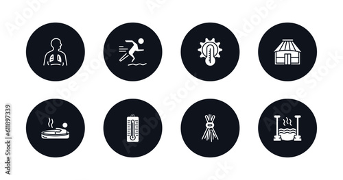 symbol for mobile filled icons set. filled icons such as respiration, adrenalin rush, hyperthermia, yurt, irish steam bath, sauna temperature, birching, roman bath vector.