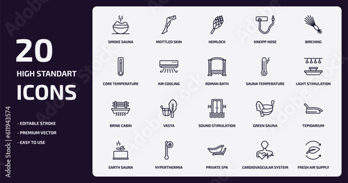 set of 20 line icons such as light stimulation, l?yly, l?yly towel, luxury shower, mottled skin, private spa, regeneration, respiration, roman bath, sauna temperature. sauna outline thin icons