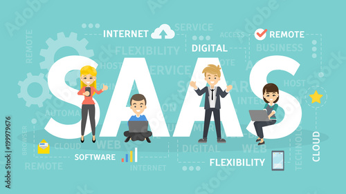 SaaS or Software as a Service landing page first screen. Remote online access to cloud application services scheme.