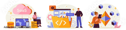 Saas technology, cloud computing, IT expert people managing web hosting server security, network connection, internet application. Software as a service concept, tech art, web banner template.